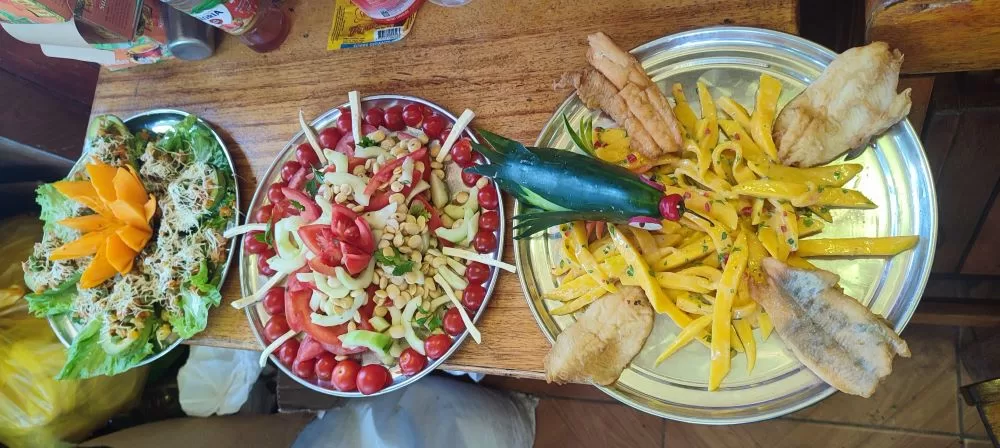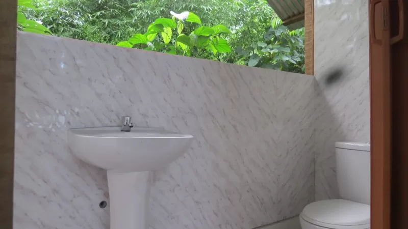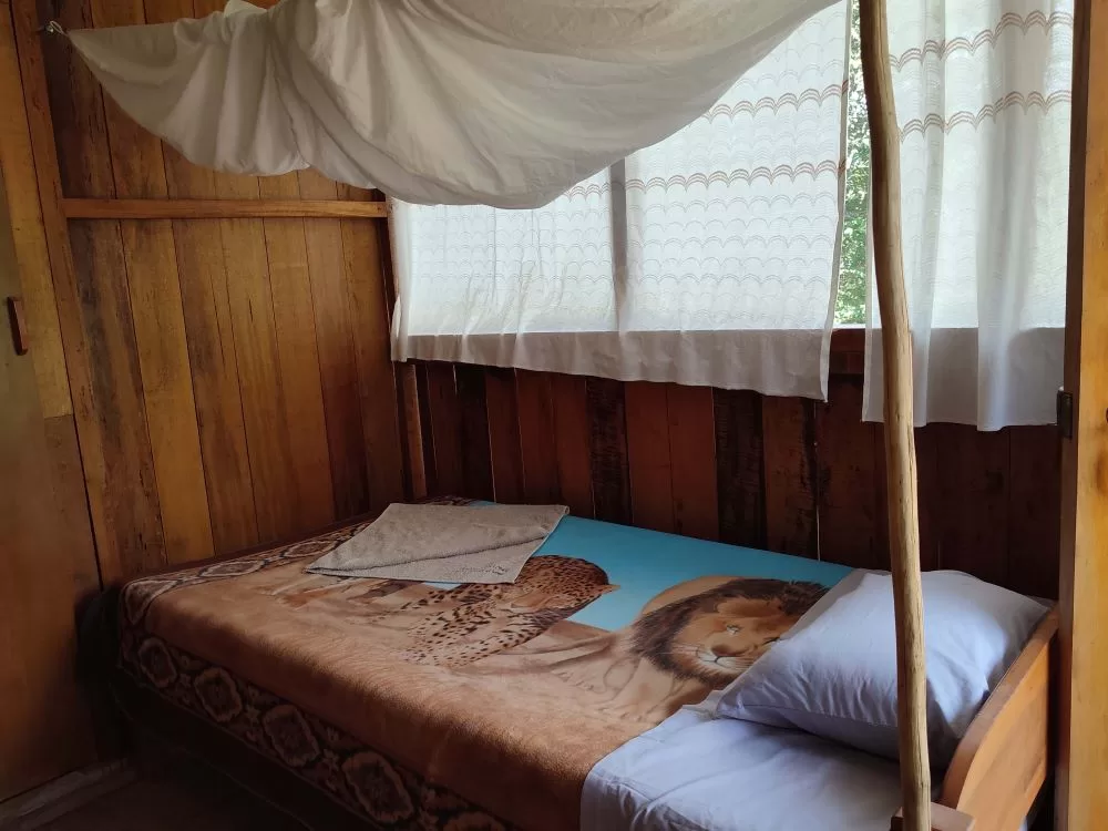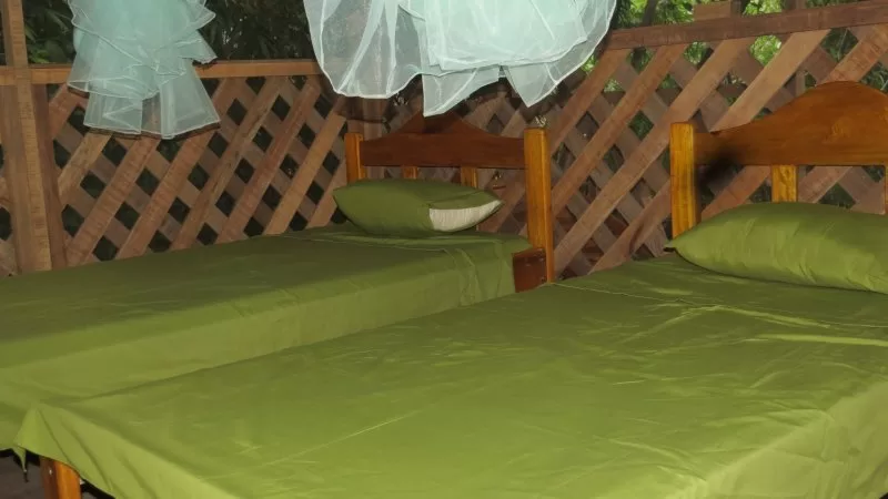 The Lodge offers 6 rooms each with two beds and mosquito nets and an outdoor dining room with wonderful views of the garden. with shared toilets and showers.
